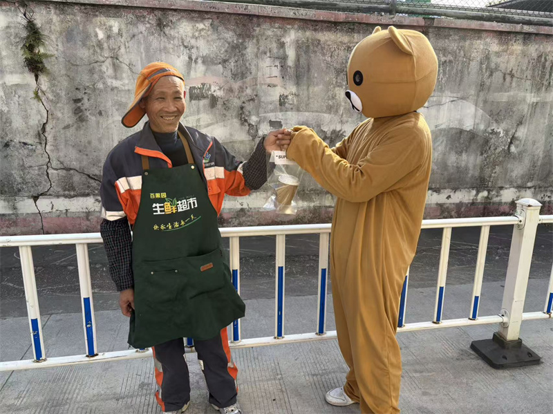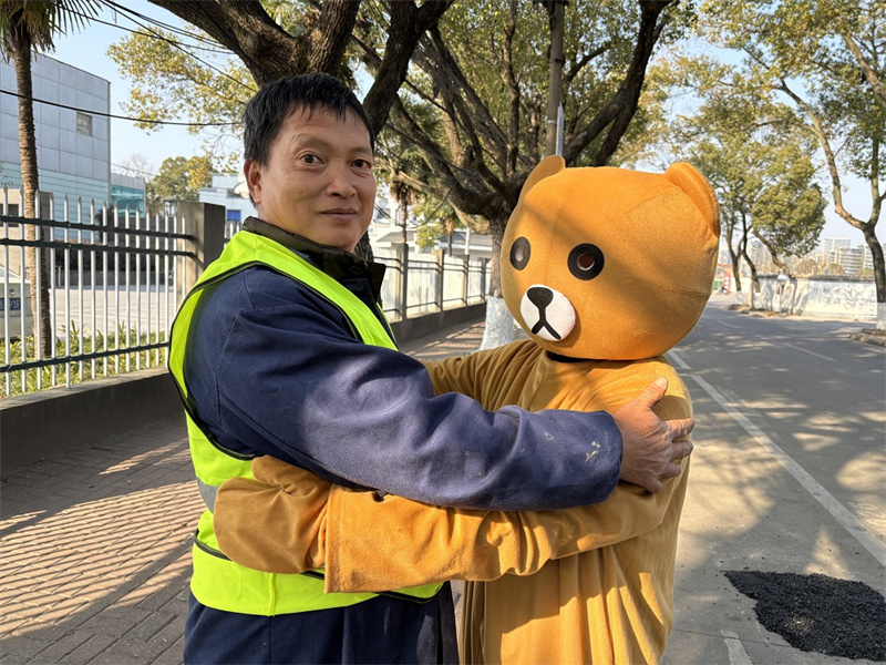 上午9点,身着大熊玩偶服装的志愿者们准时出发。憨态可掬的“大熊”一出现,就吸引了不少路人的目光。“师傅,您辛苦了!提前祝你国际拥抱日快乐!”在人民北路路口,社工陈可帆扮演的“大熊”张开双臂,给正在清扫街道的环卫工人王师傅一个大大的拥抱。突如其来的温暖让王师傅有些意外,随即露出了朴实的笑容:“这么冷的天,收到拥抱和热姜茶,心里热乎乎的。”接过温热的姜茶,王师傅喝了一口,连连称赞味道好。