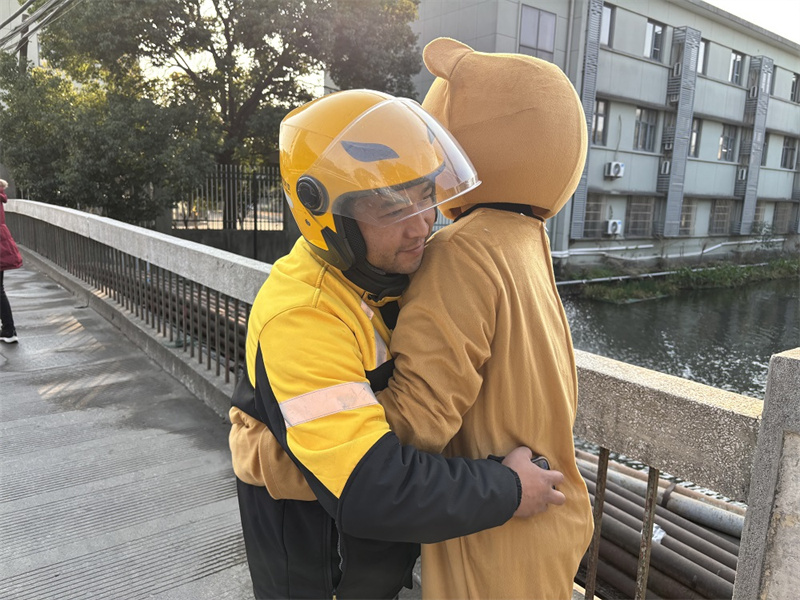 “来,先给您一个温暖的拥抱,再喝杯热姜茶暖暖身子!”1月18日上午,在国际拥抱日来临之际,邱隘镇镇北社区辖区内出现了一个个可爱的“大熊”身影,他们穿梭在路口、公园和街巷,为坚守岗位的环卫工人、快递员、户外作业人员送上暖心拥抱与热饮,用实际行动传递社区温情。