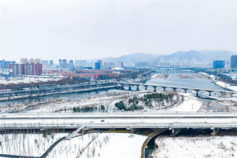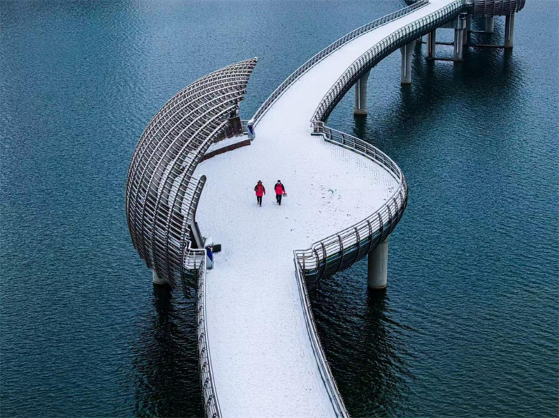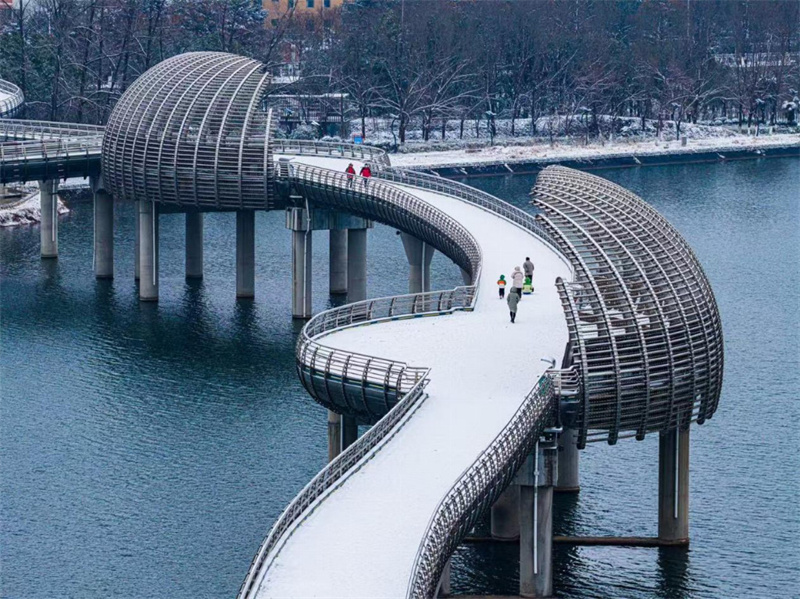 图为1月20日大雪覆盖的“网红桥”与清澈的鹳河水面构成一幅美轮美奂的水墨画卷。(文图:刘剑飞、徐晨)