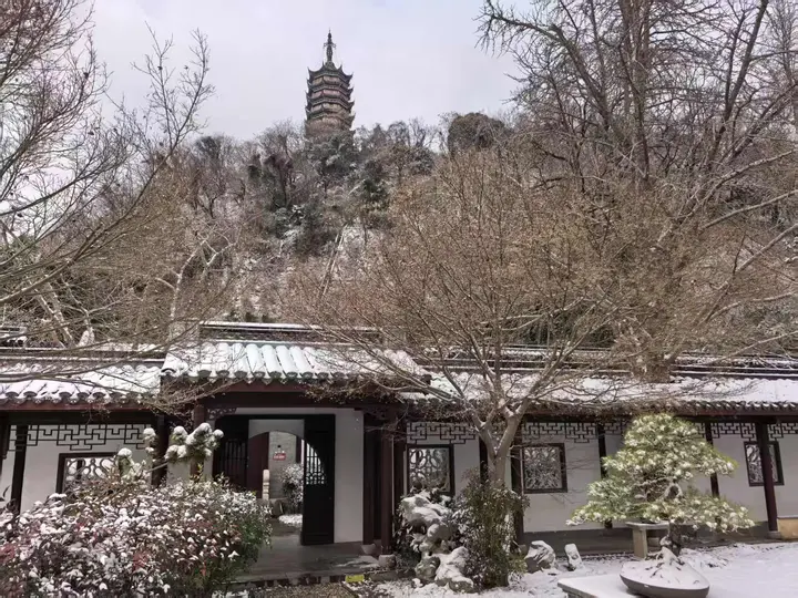 雪后的金山,白雪覆上草坪与飞檐,远处湖水苍茫;北固山上,北固楼在雪雾中若隐若现,别有一番“凭栏望江”的壮阔意境;焦山碑林、南山林间步道,也因雪景多了几分静谧与诗意。不少游客驻足拍照,用镜头记录难得的冬日风光。