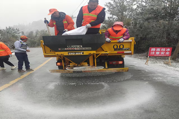 寒口坳路段,寒风裹着碎雪打在脸上。养护队员们手持铁锹、扫帚,弯腰俯身清理路面积冰,机械撒布机紧随其后,均匀铺洒融雪剂。