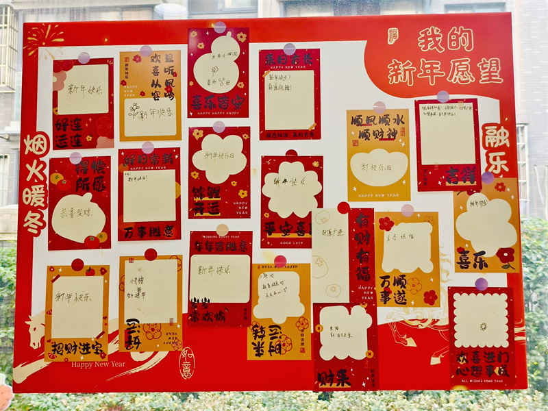 有人负责抹平奶油,有人专注切分水果,有人用裱花袋勾勒花纹,有人将采购的糕点巧妙点缀……行动不便的学员在志愿者的协助下也积极参与其中,用贴纸在蛋糕边缘加上最简单的新年装饰。制作完成后,学员们领取新年寄语卡片,写下心中的期盼:“好运新年”“心想事成”……把会写的新年祝福语一一写上,随后大家一同品尝香甜的蛋糕,在甜蜜氛围中感受归属感与幸福感。