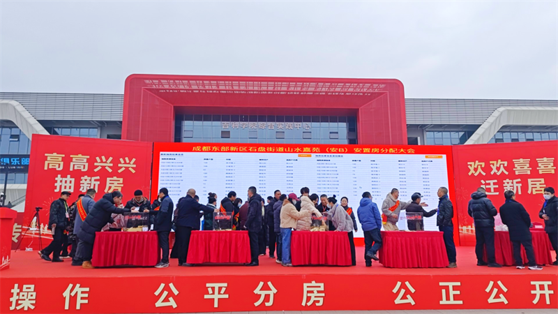 腊八刚过,年味渐浓,1月28日清晨,成都东部新区石盘街道山水嘉苑安置房分配大会,在天府国际赛道赛前广场温暖启幕,辖区银定桥、卫星、方家林等10个村(社区)的约3860位居民在这一天迎来了拿到新家钥匙的幸福时刻。
