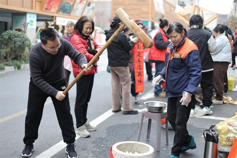 “年年高升”打年糕区堪称人气“顶流”。热气腾腾的蒸笼一掀开,白花花的年糕便散发着诱人的香气。手艺人持木槌节律敲打,软糯质感十足。一位年轻妈妈带着孩子体验,小家伙攥着迷你木槌模仿敲打,满脸新奇。捶好的年糕裹上黄豆粉,香甜软糯获众人称赞,不少居民打包带走,珍藏“步步高升”的好寓意。
