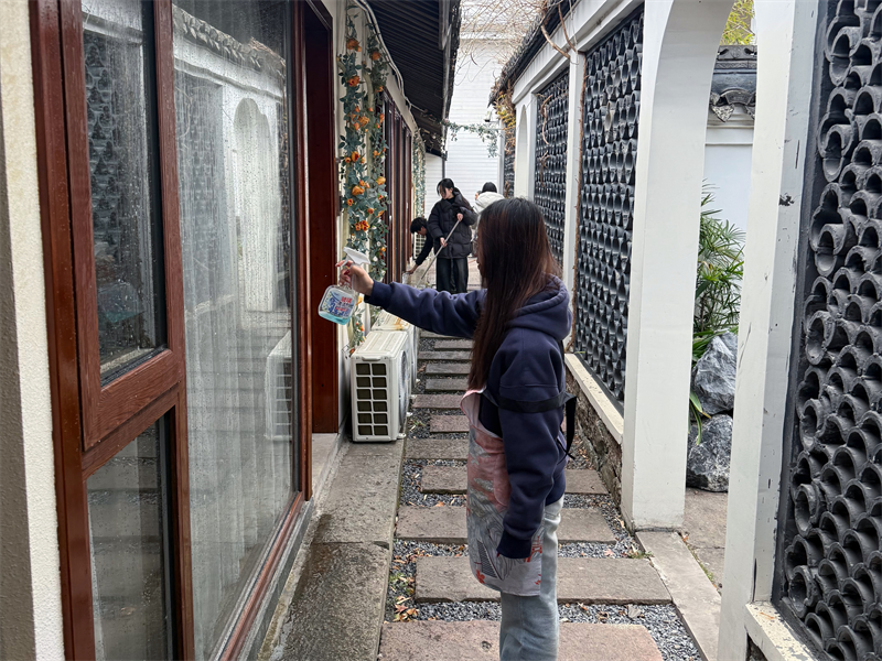 在半浦村的好婕花木家庭农场,队员们一边修剪枯枝、清理场地,一边拍摄花卉素材、优化电商文案。队员姚苏媛感慨:“以前觉得乡村振兴离我们很远,但当我亲手整理花木、帮农场写宣传语时,才真切感受到专业知识真的能帮到乡亲们。”在当地一家民宿,大家分工打扫客房、拍摄场景照片、制作新媒体内容。队长徐喆说:“希望通过我们的镜头,把乡村的美好传递出去!”