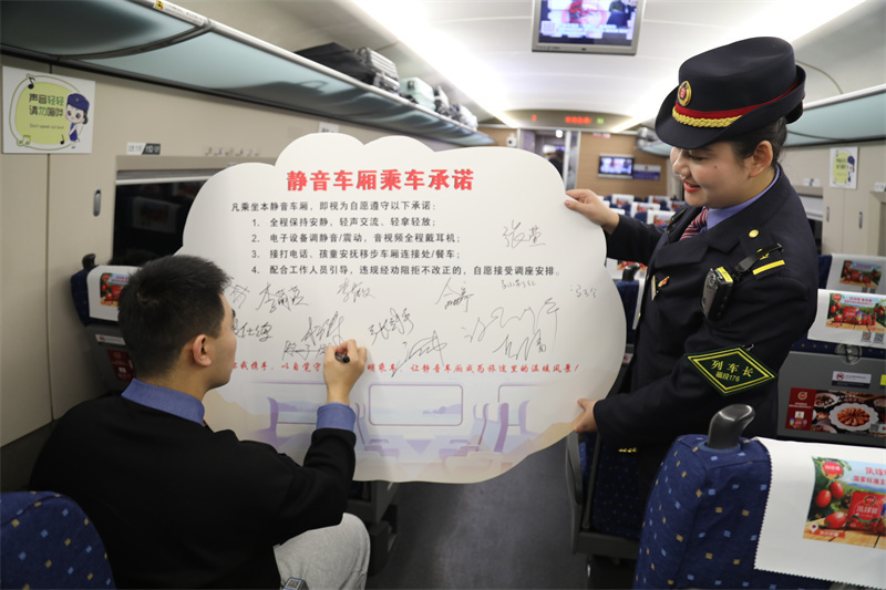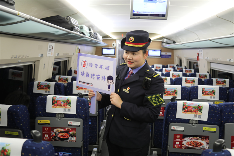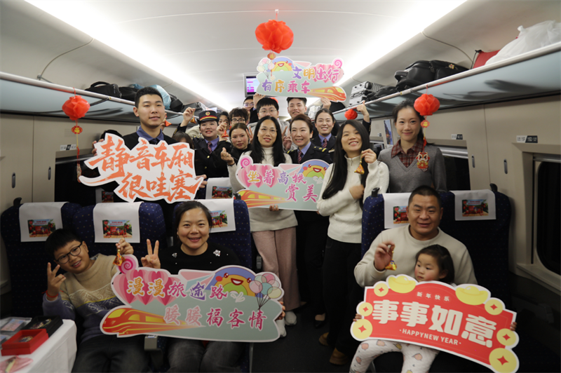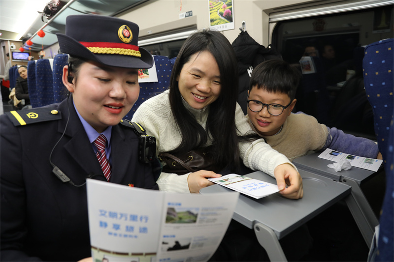 2月2日春运首日,福州客运段动车二队以国铁集团《动车组列车静音车厢服务规范》正式实施为契机,结合一季度调图值乘的福州南至重庆东G2374次旅游专线高铁列车,以“静音车厢”为载体,精心策划“文明万里行静享旅途”主题宣传实践活动,将文明乘车理念与沿线文旅风光深度融合,为旅客打造安静、舒适、文明的旅途新体验。