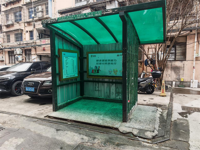 为了给督导员们创造更舒适的工作环境,让他们能更安心地提供分类指导服务,社区对小区内9个垃圾分类投放点进行了集中改造。