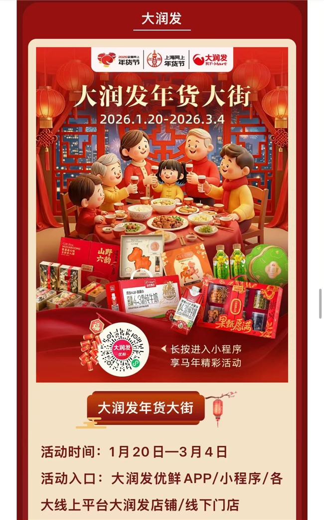 新春脚步渐近,年味日浓。为积极响应提振消费专项行动。大润发近日紧扣“马年”主题,创新打造线上线下一体化的“年货大街”,通过丰富的商品供给与趣味的民俗体验,为春节消费市场注入强劲动能。