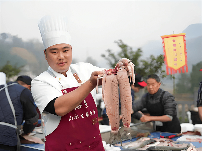 “村厨”赛场,舌尖美味凝聚浓浓乡情。在石堡乡,各村烹饪能手以生态鱼为核心食材,亮出看家本领,每一道菜都承载着群众的生活智慧与对美食的热爱。不止石堡乡,各乡镇的“民间大厨”也各怀绝技,以赤水乌骨鸡、生态鱼、农家猪等本地食材,在颠锅翻炒间香气四溢。灶台烟火不仅拉近了乡邻距离,更让游客在品尝地道风味的同时,感受赤水的淳朴民风。