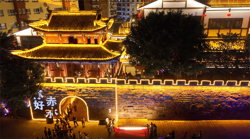 2025年9月,赤水·老城记忆文化旅居生态圈正式开街,迅速成为热门打卡地。从聚金门到石沓沓,仿真花景与璀璨灯光交相辉映;青石板路蜿蜒伸展,串联起古老城墙与现代商铺。街区内,万寿宫展陈生动讲述赤水故事,竹编、竹雕等非遗技艺现场展演,酱香酒体验馆与特色小吃摊相映成趣,构成一幅活态的人文风情画卷。同年夏季,赤水恐龙岛水上乐园顺利开业,为家庭亲子游客提供了全新的清凉娱乐选择,实现营收486万元。