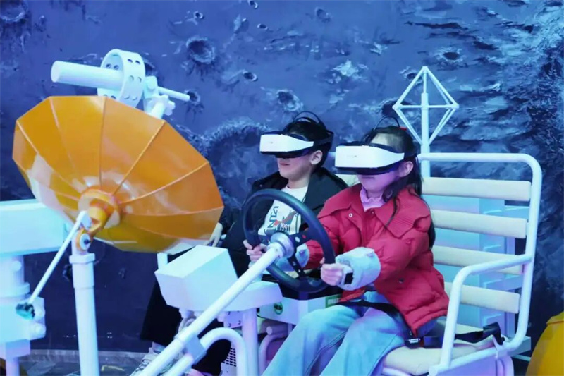VR的强交互特性,需要家长和孩子组队“打怪”,在虚拟的航天舱里一起完成太空任务,在“时空秘境”里共同寻找线索。带孩子来体验的市民刘梦露感慨:“孩子在这里边玩边学,既能感受航天科技,又能开阔视野,真正做到了寓教于乐。”