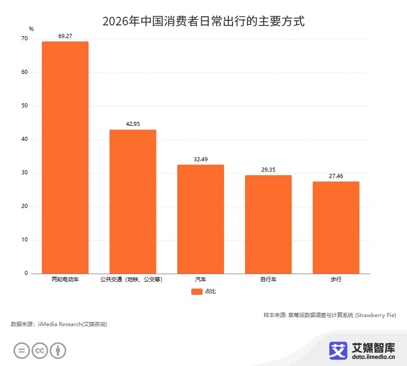 作为中国城市交通体系的“核心毛细血管”,两轮电动车凭借高频刚需、全民覆盖、场景多元的特性,市场基本盘愈发稳固。iiMedia Research(艾媒咨询)《2026年两轮电动车消费者洞察数据》显示,两轮电动车以69.27%的占比,稳居中国消费者日常出行方式前列,远超公共交通、私家车与自行车。