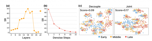 研发团队在消融实验中发现了一个违反常理的结论:从视频模型提取特征时,只需单步去噪效果最好,步数越多、太清晰,性能反而下降。提取层也有讲究,第 18层(中间偏深层)的特征最优,达到性能峰值。