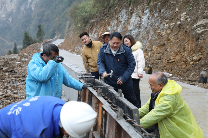 工作队查看郑家河组通组公路修建。