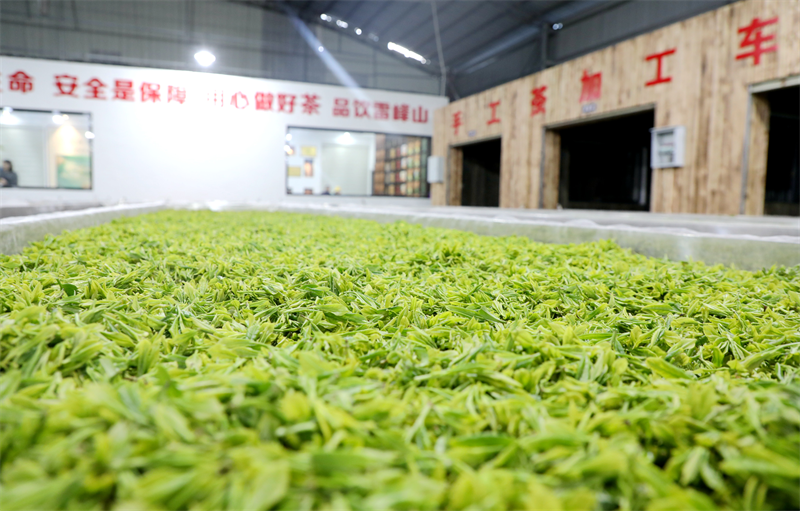在传承传统工艺的同时,彭泽县东升镇积极拥抱现代化生产。走进雷峰尖的现代化茶厂,杀青机、摇青机、烘干机等先进设备一应俱全,大幅提升了茶叶加工的效率和标准化水平。2023年,当地投资220万元建成标准化厂房1000多平方米,设有国内先进的有机茶加工生产线,严格执行“鲜叶摊青→杀青→分级→揉捻→脱水→理条→烘焙”的标准化流程,年加工各类茶产品3万余斤,产业收益超900万元。“以前是传统的做法,手工做,烧柴火,现在是全自动流水线,不仅节约了成本,提升了制作效率,而且工艺改变之后,茶叶的品质、色泽、口感、香气都有明显的提升。现在我们正在跟杭州中茶所积极沟通,能不能通过深加工提升雷峰山茶的附加值,现在他们建议茶叶可以做茶酒,这个茶叶做酒,我们也积极地在探索。”彭泽县雷峰尖茶叶有限公司总经理盛承友说。