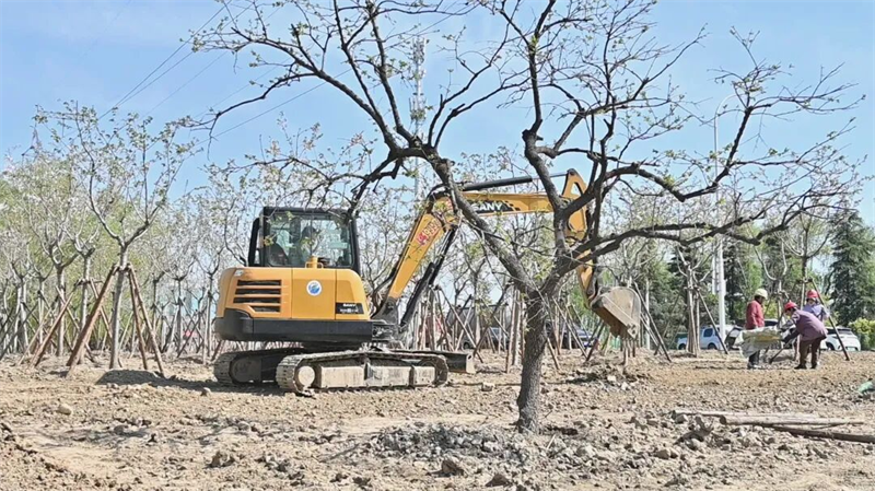 春和景明,万物向荣。漫步在江苏省淮安市清江浦区城南街道诚意路,沿途100余株新移植的樱花树绽放如雪,树下几位工人正用铁锹敲碎泥块、清理碎石与垃圾,为后续铺设草坪做准备。站在路边透过樱花枝丫向西望去,隐约看到数台挖机正有条不紊地平整土地、清淤鱼塘。