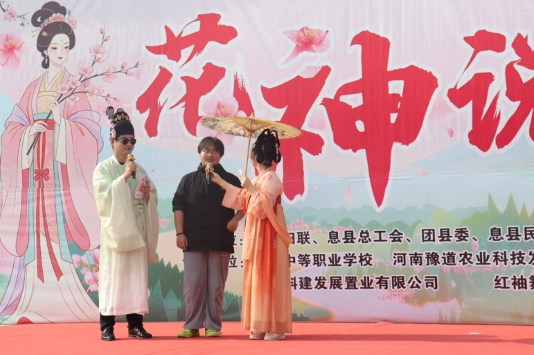 就在这时,耳边锣鼓声骤然响起。非遗旱船巡游队伍从游客中心出发,粉缎扎成的彩船随鼓点起伏摇曳,船头的“艄公”白须飘飘,唱腔诙谐,逗得路边老人笑得合不拢嘴;队伍行至自然博物馆前,原本围观的人群忽地爆发出掌声——主舞台上“花神说媒”环节正到高潮:一身霓裳的“花神”手持花枝,将一位腼腆的年轻小伙请上台,几句俏皮话逗得他耳根通红,台下观众齐喊“缘分到了!”气氛热烈如春潮。