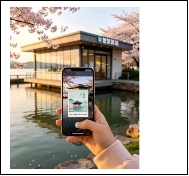 游客在鼋头渚景区打卡点,扫码生成AR专属江南风海报的手机界面特写,背景为景区实景与智慧驿站外观;