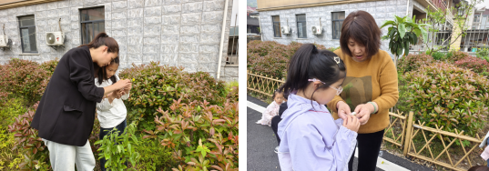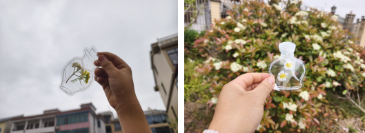 随后亲子家庭移步花园开启创作:家长们细心收集落叶与落花,孩子们用压花书签将自然碎片拼贴成画,有的做成太阳形状,有的拼出爱心图案。当一幅幅融合分类知识与艺术创意的作品诞生时,8岁的思宇举着自己的作品兴奋地说:“我要把这个书签送给奶奶,让她买菜时记得带环保袋!”